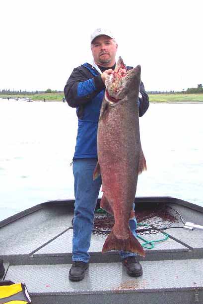 | Without exception, the Kenai is the greatest salmon river in the world, with the credits to prove it.  A 97 pound, world record King Salmon was wrestled from its waters in May of 1985.  The river sports two major runs of kings and also hosts three other species of salmon, not to mention Dolly Varden and Rainbow Trout in excess of 20 pounds.  The icy emerald waters of the Kenai originate in the Harding Ice Field and flow through Kenai Lake on an 82 mile journey to Cook Inlet.  The versatility of offering drift boat and power boat allows us to fish the entire river.  We also have the Kasilof River at our convenience, just minutes away.  With a 2 king limit on the Kenai: 1 per day or 2 per season, the drift boat allows us to fish the action filled Kasilof, where 3 more kings can be taken: 1 per day or 3 per season.  The Kasilof, just south of Soldotna, has the highest success rate for King salmon on the Kenai Peninsula.  We've had clients hook and release over 7 Kings in an eight-hour trip. |