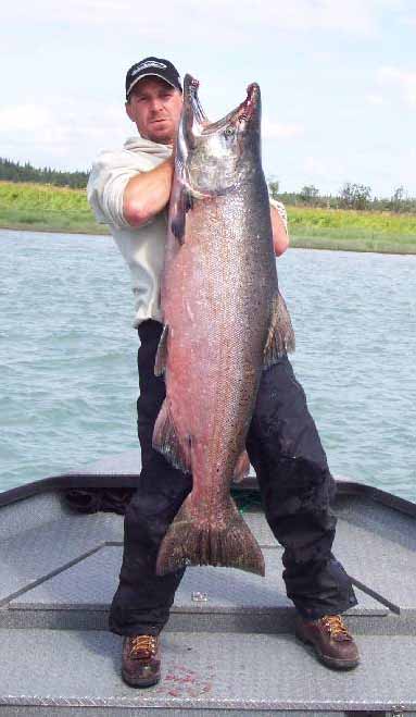 | Besides the beauty, scenery, and wildlife, the Kenai River has one thing no other river in the world can claim; the expectation of hooking a fish of 70 lbs or more.  The power of these fish is amazing and the excitement is contagious.  The kings come up the river as early as April and continue to run till July 31.  The Kasilof is a great river for action.  These kings don't get as big as the Kenai kings, they average around 20-40 lbs.  Fishing this river is an excellent way to round off a Kenai Peninsula fishing trip.  Fishing the Kasilof will pick up your spirits when the Kenai has been slow. |
