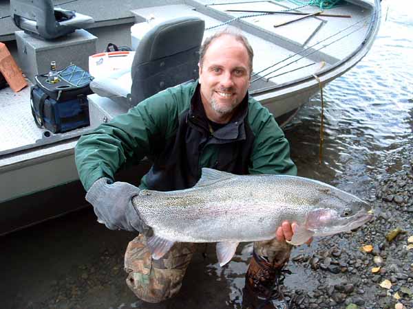 | June 15th starts the rainbow season.  This wild fighter could go 17 pounds or more.  These are not hatchery trout, and they are an absolute thrill to catch with line stripping runs and acrobatic leaps.  To keep the integrity of the Kenai Rainbows, they are strictly catch and release. |